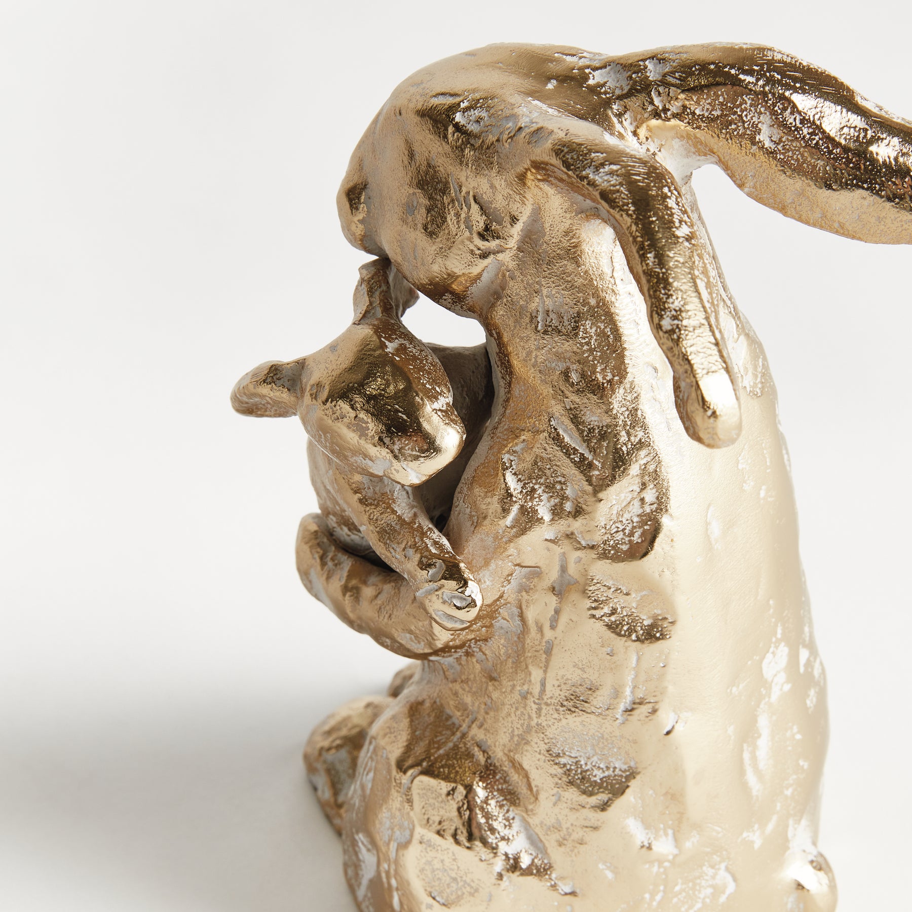 Detail view of mother rabbit sculpture holding baby, white ash gold aluminum surface with organic texture, rustic decor