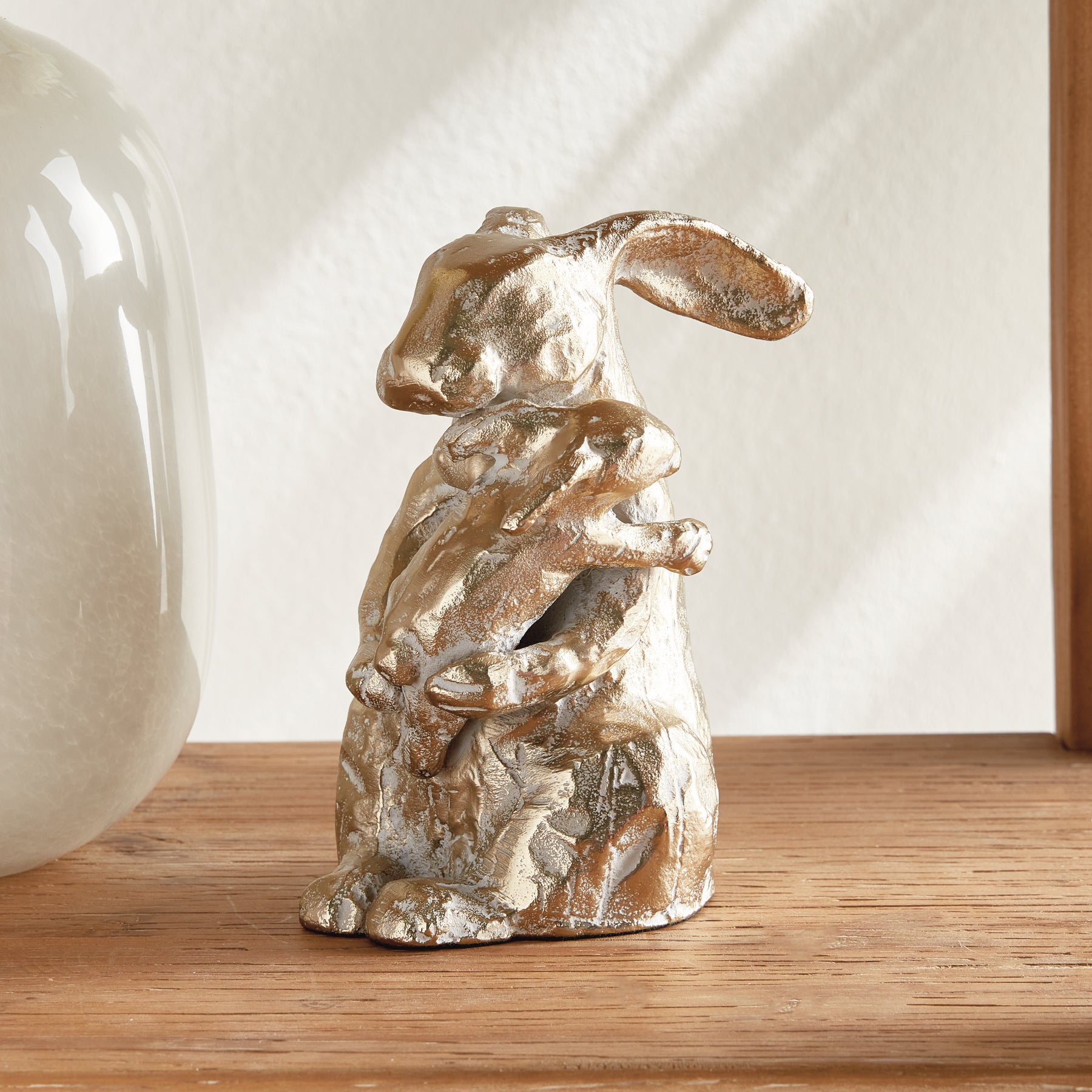 White ash gold mother rabbit sculpture styled on tabletop, aluminum animal accent with warm metallic texture, rustic decor