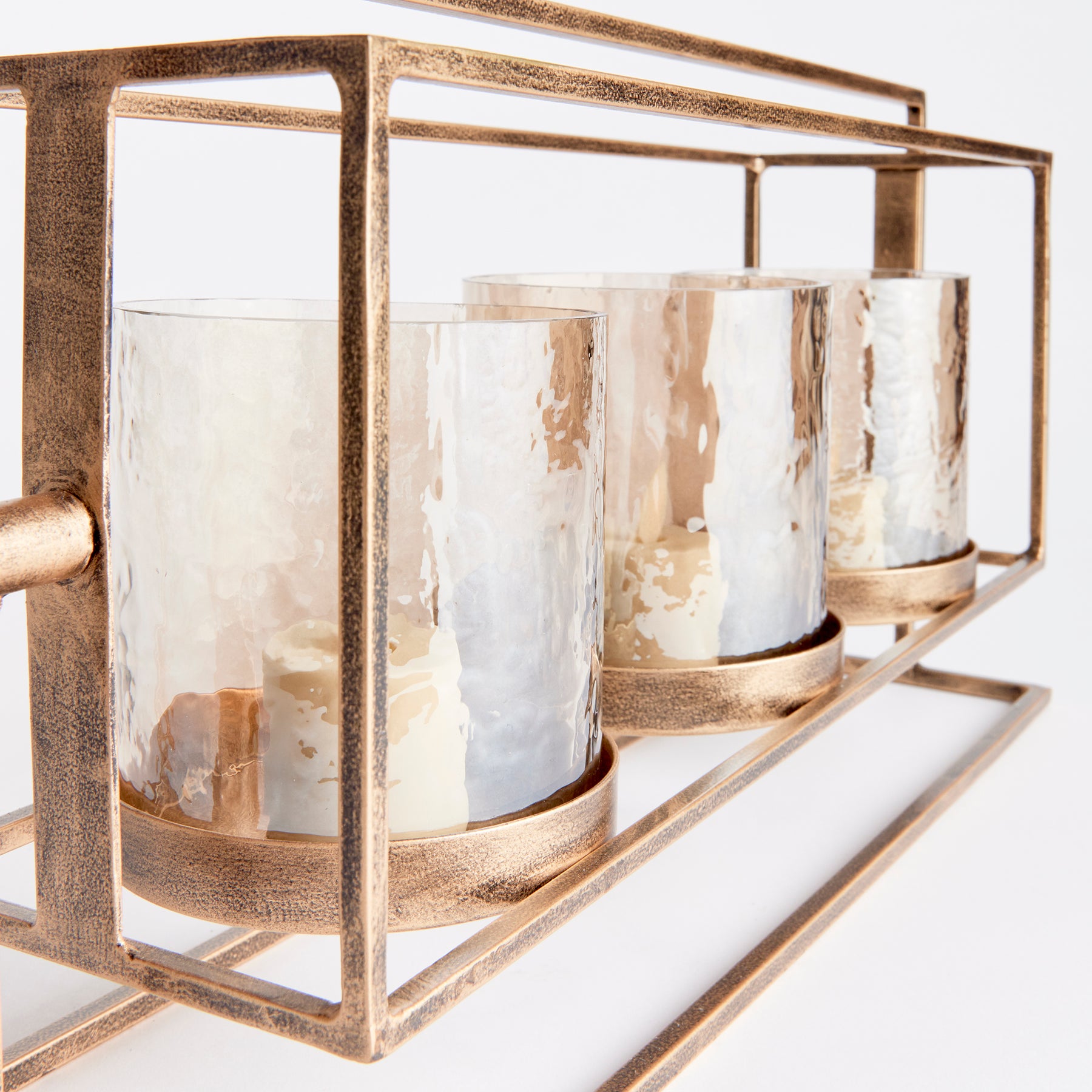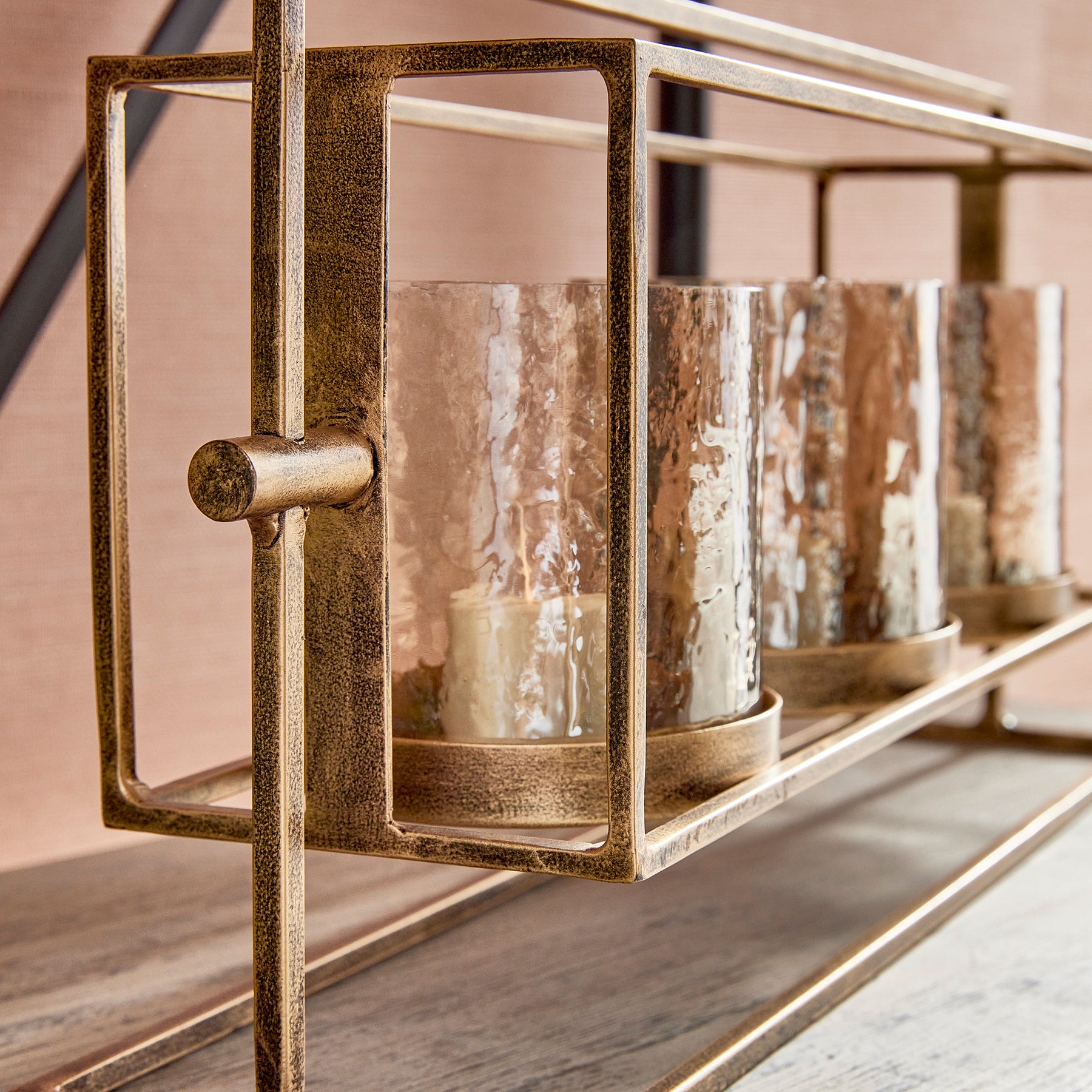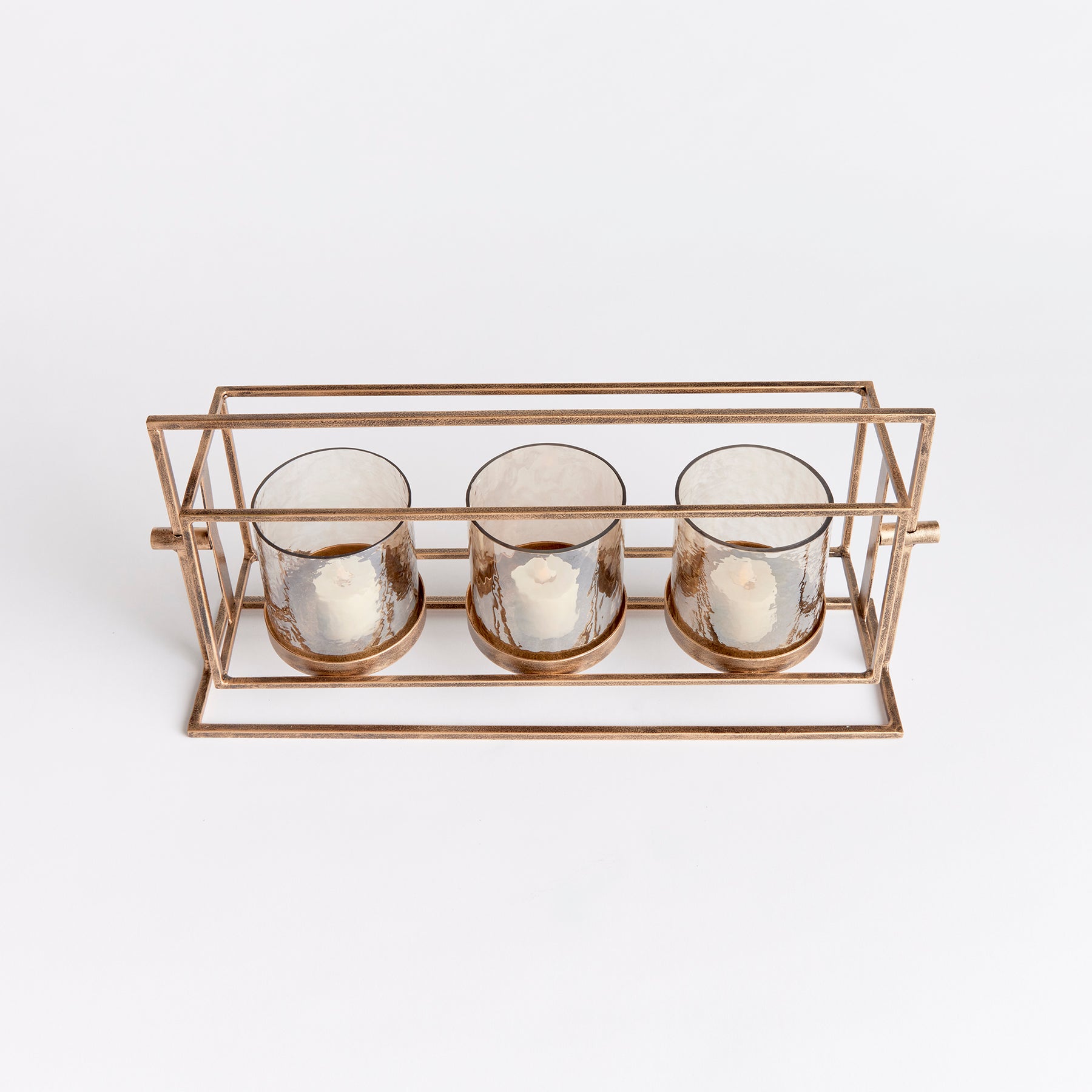 With a warm antique gold finish, elevated design and hammered lustre glass hurricanes, this triple candleholder is a work of art. Perfect for dining table centerpiece or as a feature for the kitchen island.