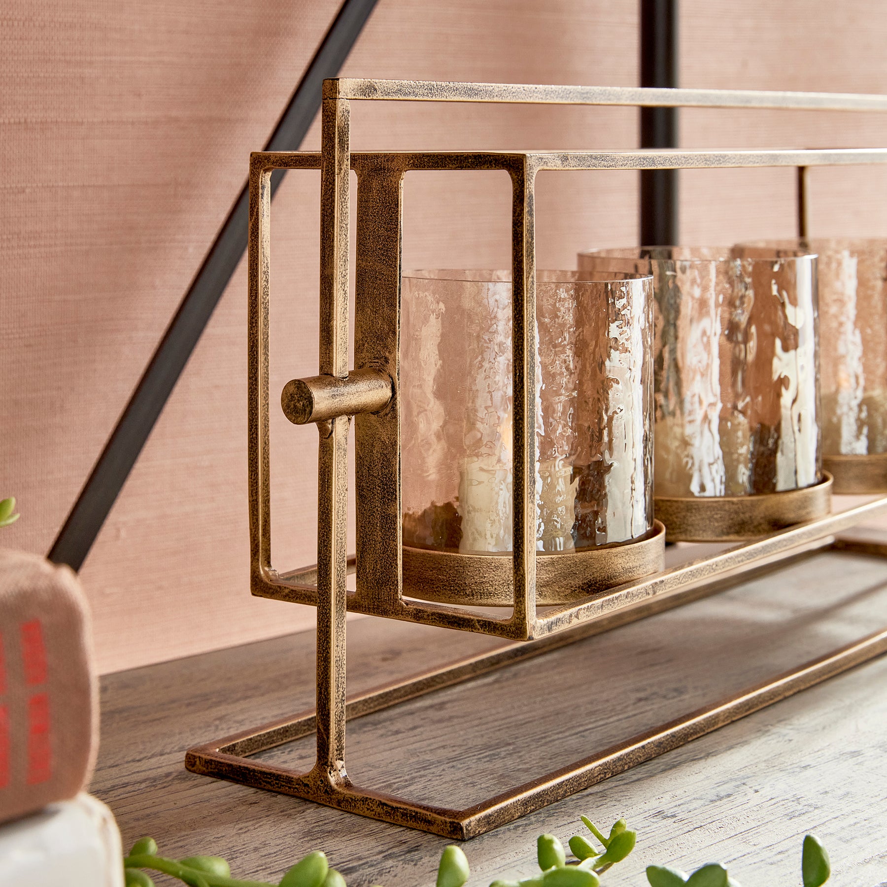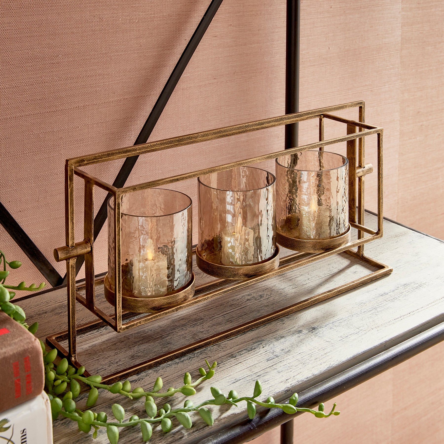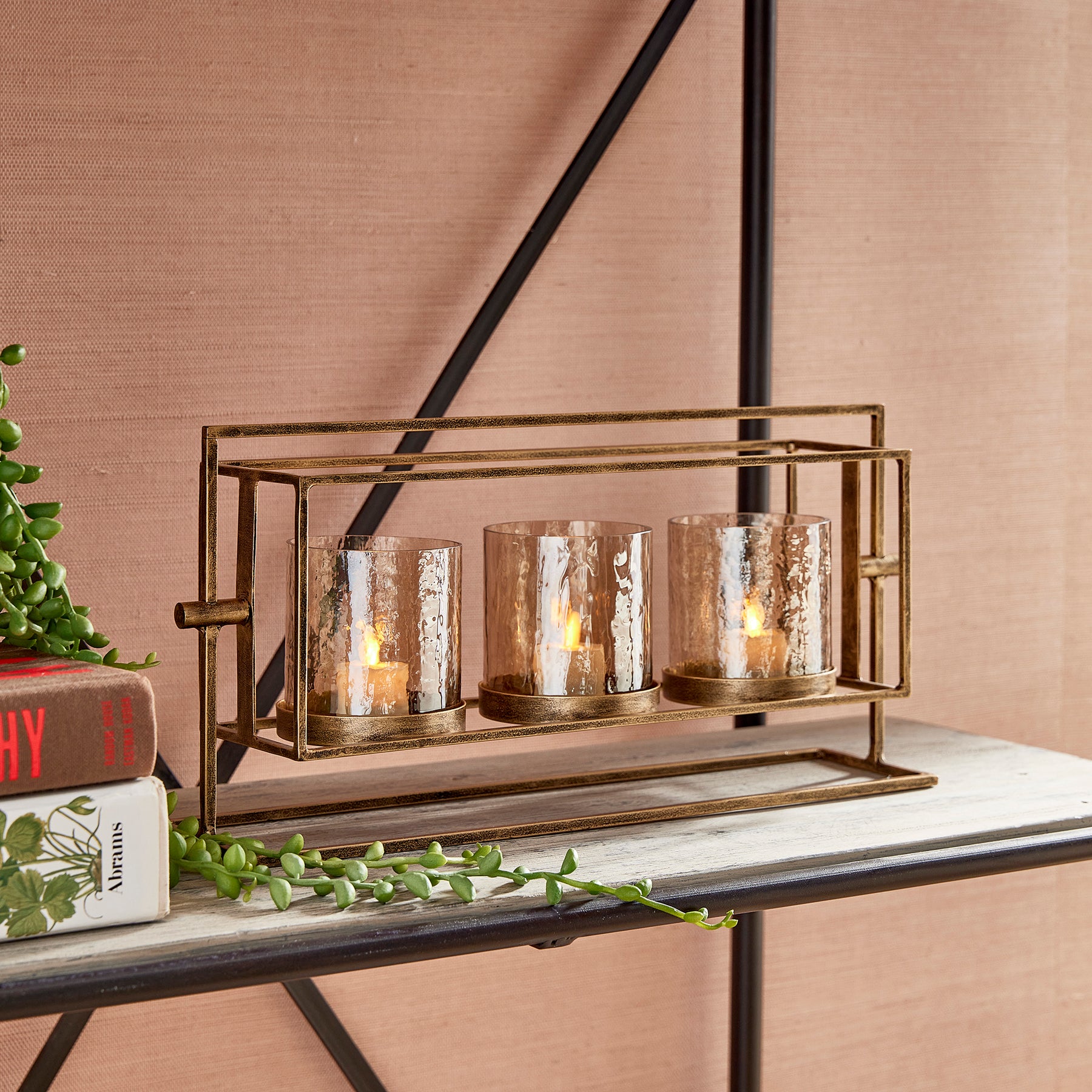 With a warm antique gold finish, elevated design and hammered lustre glass hurricanes, this triple candleholder is a work of art. Perfect for dining table centerpiece or as a feature for the kitchen island.