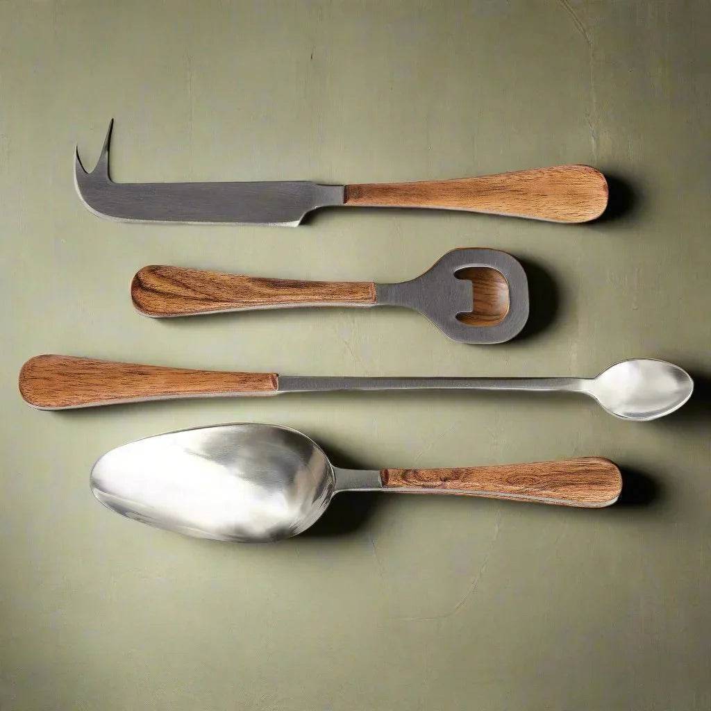 The set includes a cocktail spoon, bottle opener, ice scoop, and an all-purpose pronged knife, making it versatile for a range of bartending needs. Each piece is thoughtfully designed for ease of use, offering a perfect balance of weight and comfort. The stainless steel finish ensures long-lasting quality, while the acacia wood adds a natural, warm aesthetic that complements any decor.