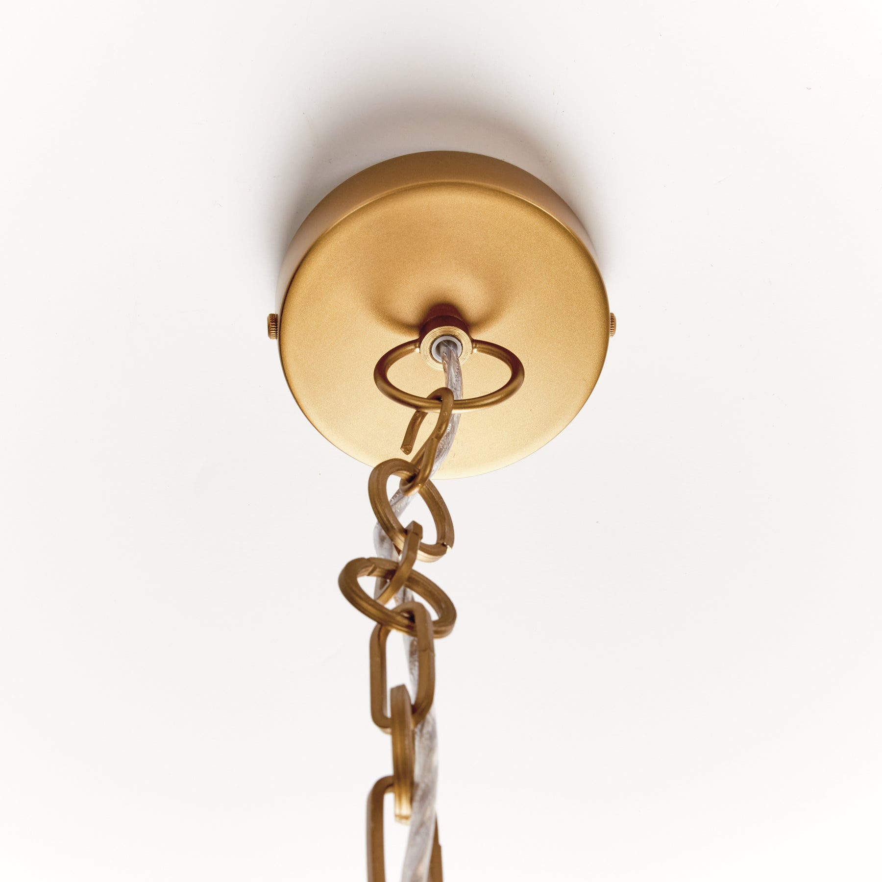 Ceiling canopy and chain detail of large gold iron dome pendant light showing mounting hardware and suspension connection. Contemporary