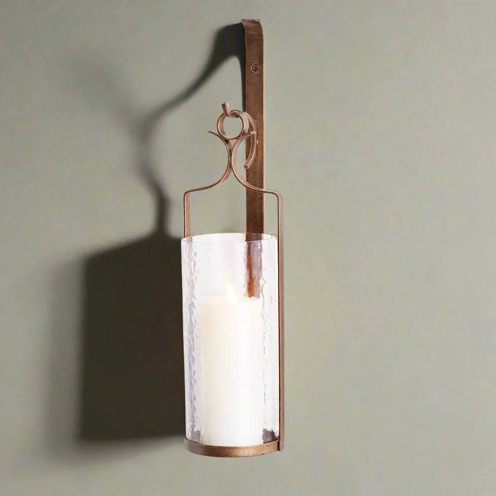 Warm up your wall with a tall, antique-gold candle sconce—an iron frame and hammered-glass cylinder that turns a simple LED pillar into inviting, architectural glow.