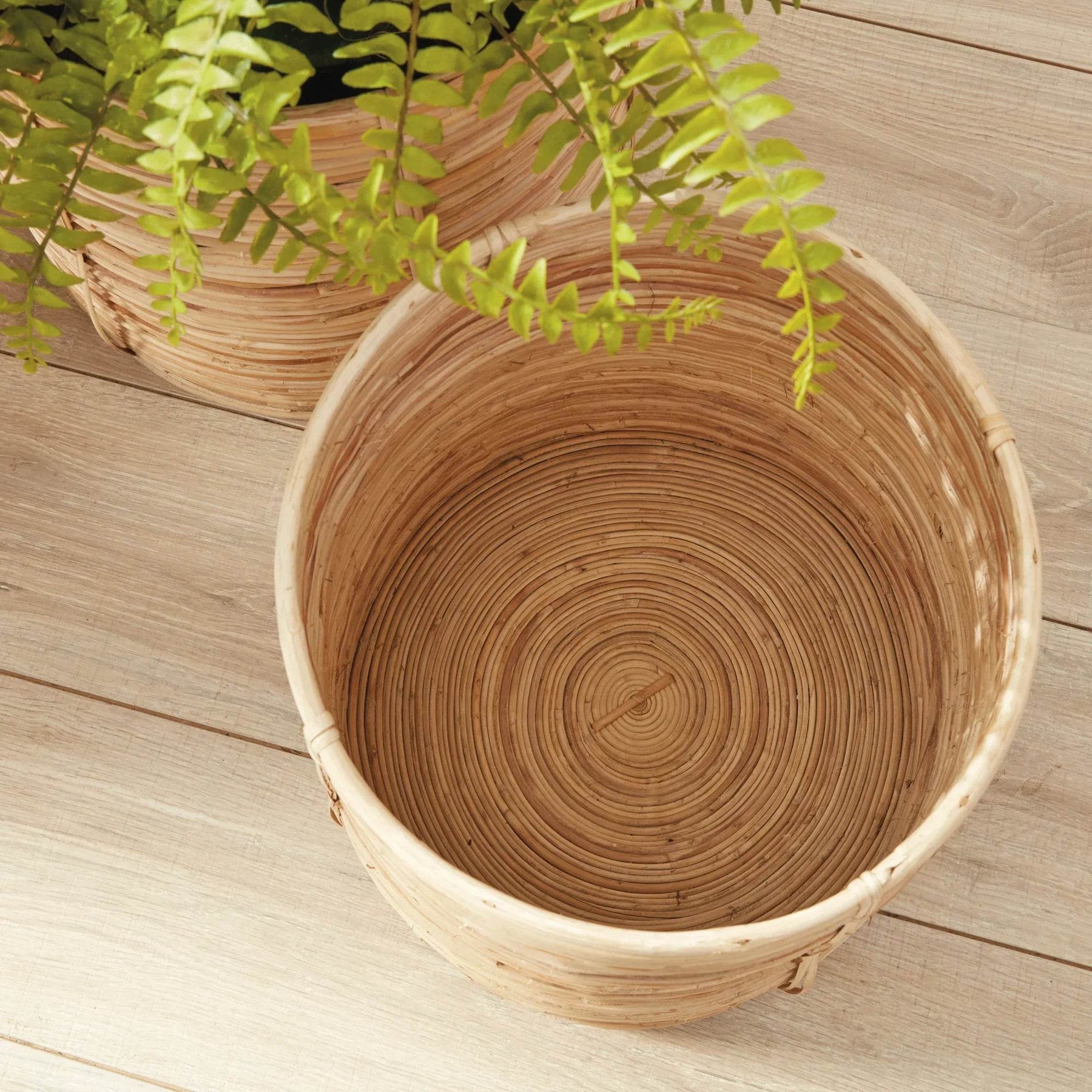 Our Cane Rattan Round Tree Baskets, Set of 2, add a modern touch to natural home decor. These round cane rattan baskets feature a light, refined color and a clean, edgy aesthetic, making them perfect for both contemporary and bohemian spaces. Handcrafted from natural cane rattan, each basket boasts an airy yet durable structure, offering style and functionality.